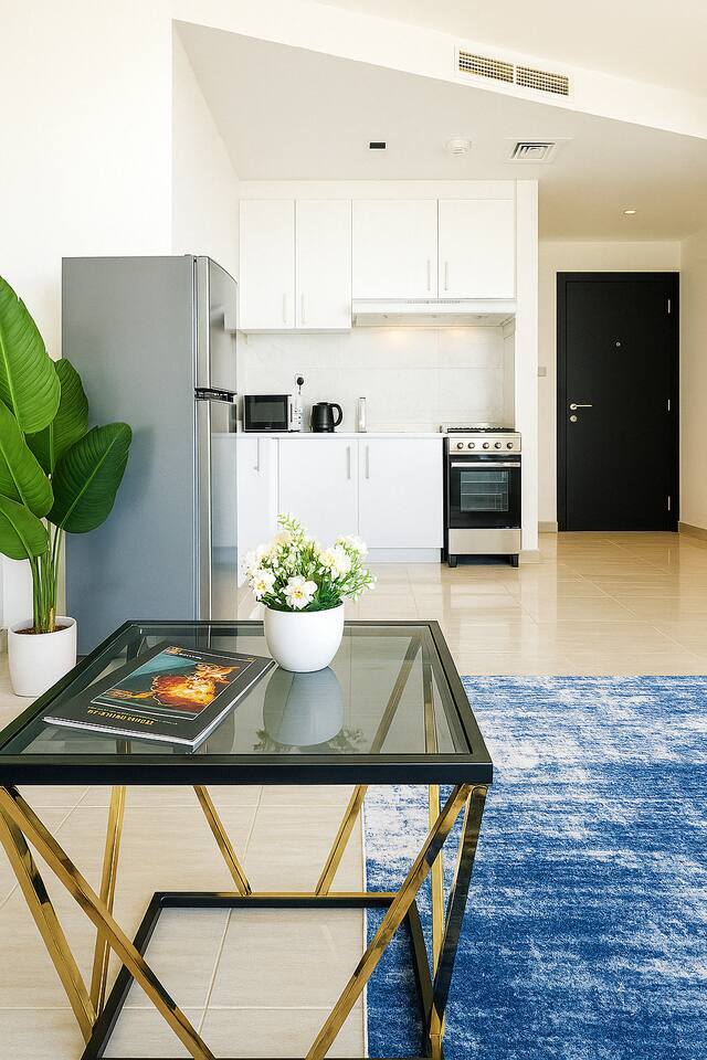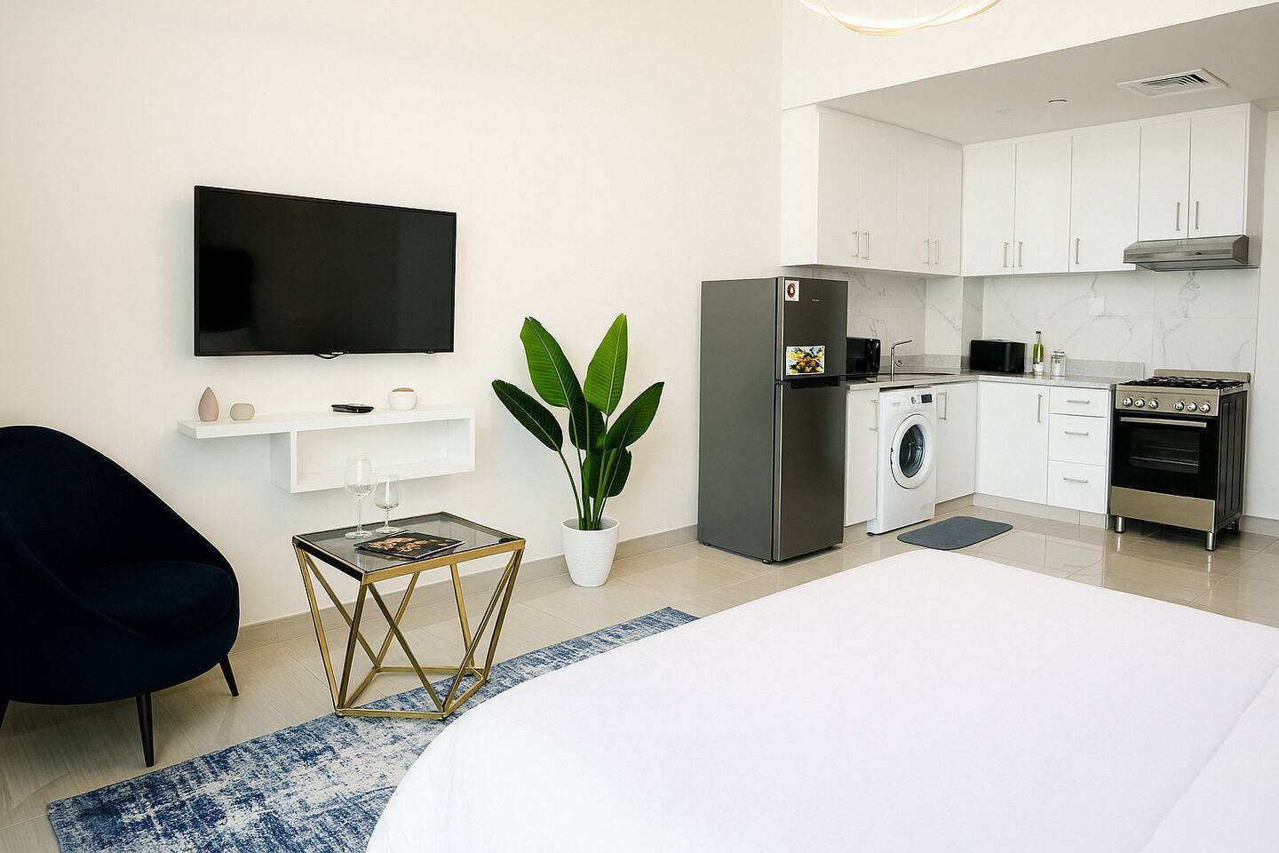The Space: Our thoughtfully designed studio apartment offers a comfortable and stylish environment. The studio is equipped with all the essentials you need for a comfortable stay, including a fully equipped kitchenette for preparing light meals and snacks. ⚠️ Disclaimer This property is professionally managed by Malinstay Homes Rental LLC, fully licensed under the Dubai Department of Tourism and Commerce Marketing (DTCM). As per DTCM and community regulations, all guests are required to submit a valid Emirates ID or passport copy before check-in. The details will be securely shared only with the DTCM portal and building management for registration and access approval in accordance with UAE laws. Guests are requested to inspect all furniture and amenities upon arrival. Any damages, defects, or maintenance issues should be reported immediately to our team. Failure to report issues at check-in may be considered as acceptance of the property’s condition. Repairs or replacements will be arranged promptly where required. Please note that the property is located in a residential community. Guests are expected to respect neighbors, follow building rules, and comply with all UAE regulations during their stay. Malinstay Homes Rental LLC will not be liable for personal belongings, accidents, or external factors such as building maintenance or community noise beyond our control. We aim to ensure a comfortable and enjoyable experience for all our guests — your cooperation is greatly appreciated.