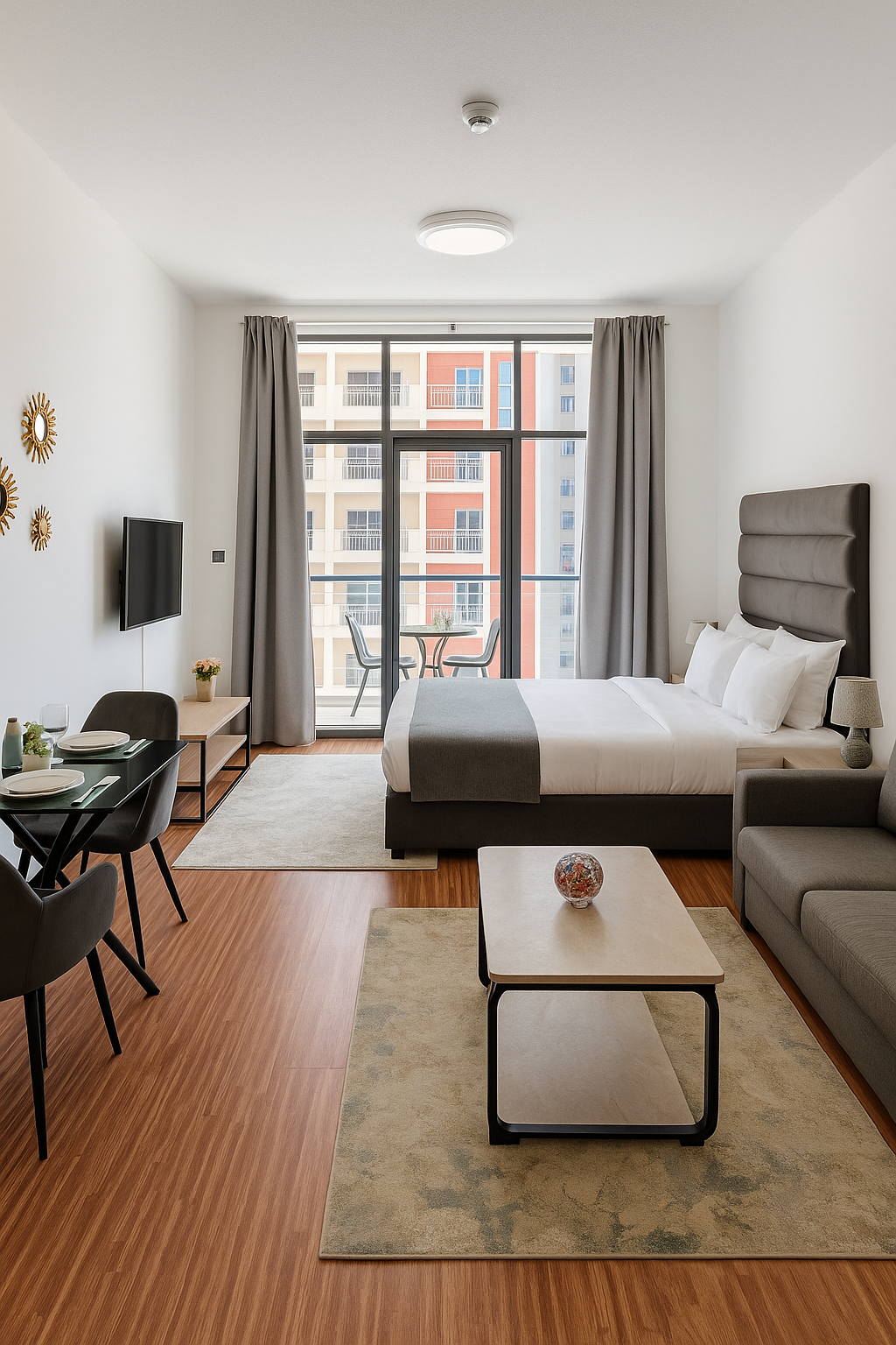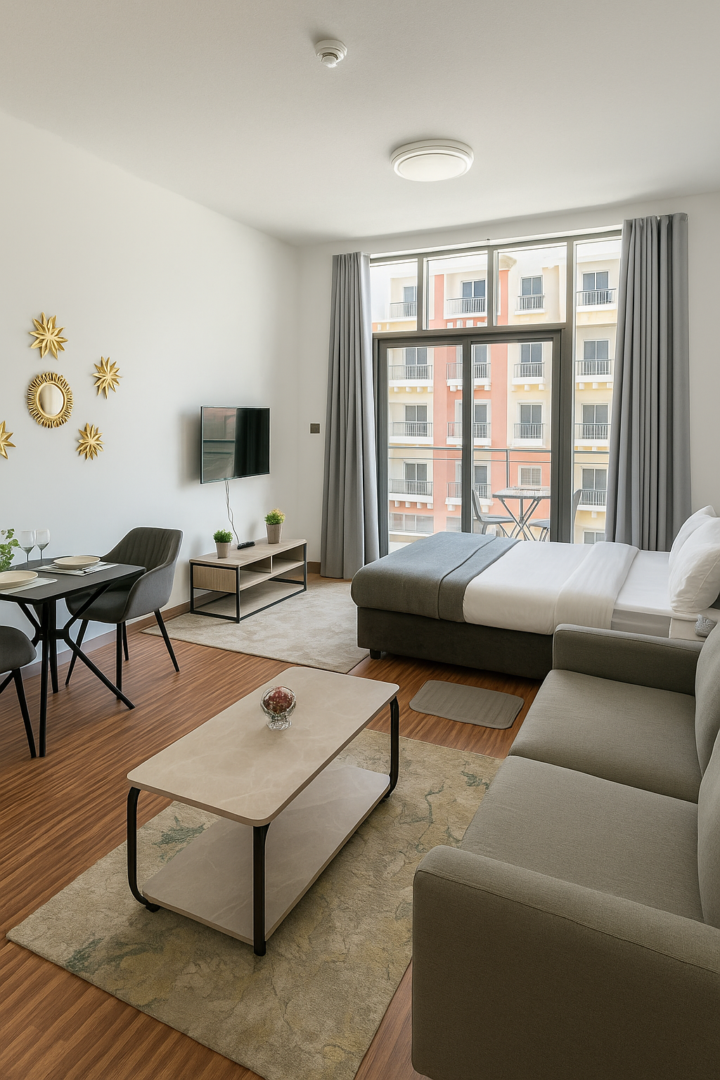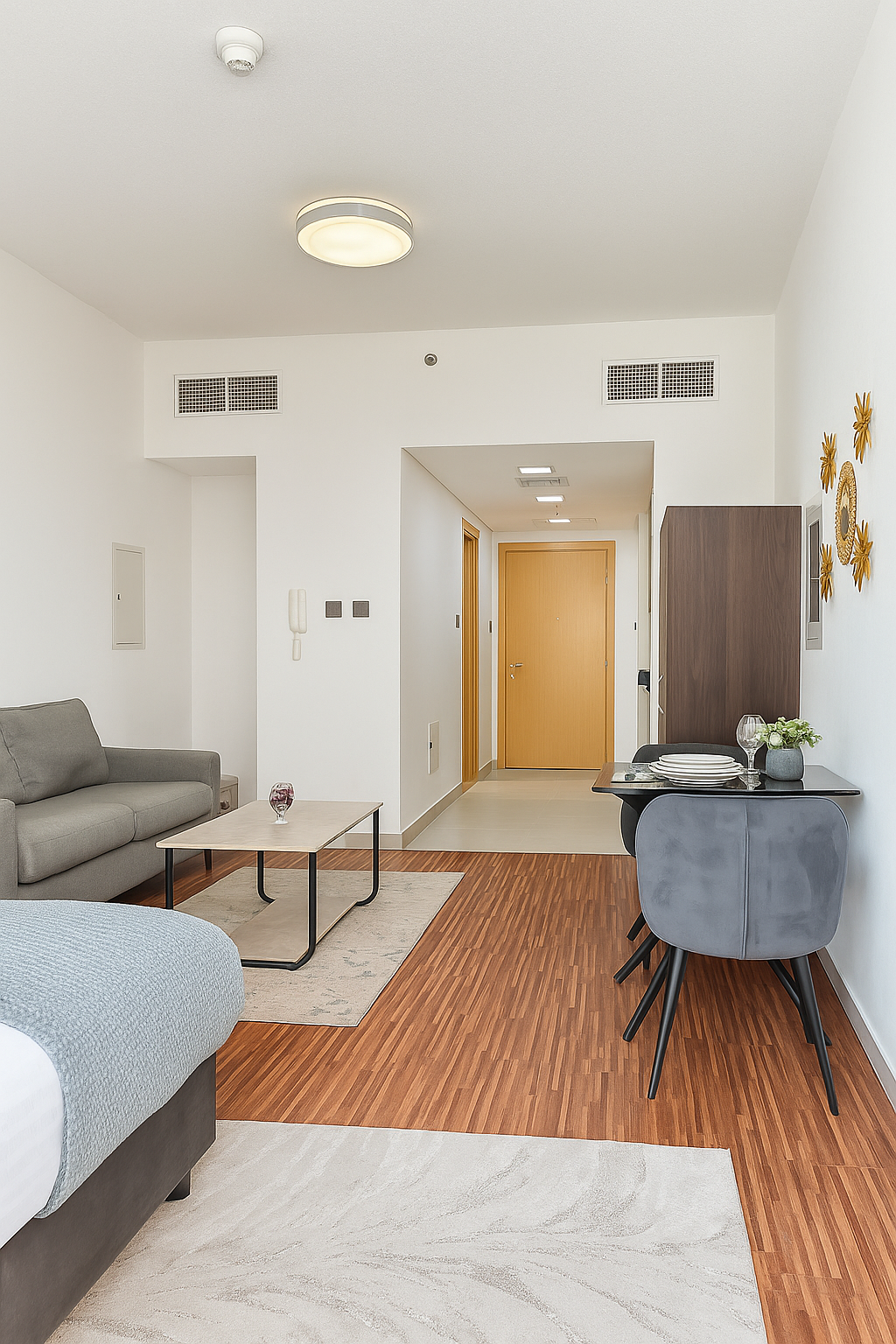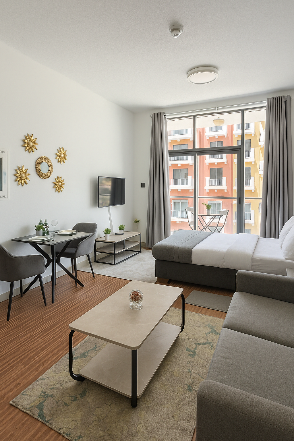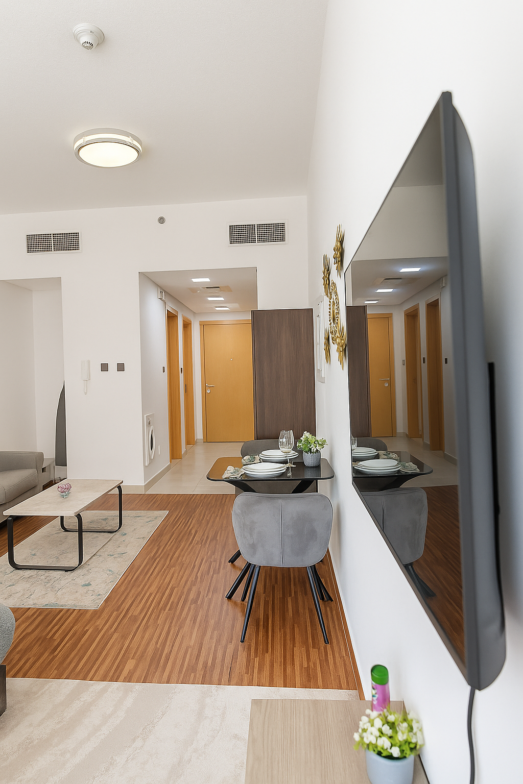 **Other Details to Note:** - **Location:** Our studio apartment is located in the heart of JVC, a vibrant and peaceful community offering easy access to major attractions in Dubai, such as Mall of the Emirates, Dubai Marina, and JBR Beach. It's a perfect spot for both short-term and long-term stays. - **Parking:** Free parking is available on-site. You’ll have a dedicated parking spot, so no worries about finding a place to park. - **Public Transport:** The apartment is well-connected with public transportation. The JVC area is serviced by bus routes, and the nearest metro station (Dubai Internet City) is just a short drive away, making it easy to explore the city. - **Building Amenities:** The building features a swimming pool, a well-equipped gym, and 24/7 security for your safety and convenience. - **WiFi & Entertainment:** High-speed WiFi is provided, along with a smart TV equipped with streaming services for your entertainment. - **Air Conditioning:** The apartment is fully air-conditioned to keep you comfortable, no matter the weather outside. - **Quiet Hours:** Please be mindful of noise after 10 PM, as JVC is a residential neighborhood, and we want to respect all neighbors. - **Check-In/Check-Out:** Standard check-in time is after 3 PM, and check-out is by 11 AM. Early check-in or late check-out can be arranged based on availability, but please confirm with us in advance. - **Safety:** The apartment is fully equipped with smoke detectors, a first-aid kit, and a fire extinguisher for your peace of mind. - **House Rules:** No parties, pets, or smoking are allowed inside the apartment. Kindly respect the property and neighbors during your stay. Disclaimer: This property is professionally managed by Malinstay Homes Rental LLC, fully licensed under the Dubai Department of Tourism and Commerce Marketing (DTCM) with the permit number "ALB-PAN-UBOAZ". As per DTCM and community regulations, all guests are required to submit a valid Emirates ID or passport copy before check-in. The details will be securely shared only with the DTCM portal and building management for registration and access approval in accordance with UAE laws. Guests are requested to inspect all furniture and amenities upon arrival. Any damages, defects, or maintenance issues should be reported immediately to our team. Failure to report issues at check-in may be considered as acceptance of the property’s condition. Repairs or replacements will be arranged promptly where required. Please note that the property is located in a residential community. Guests are expected to respect neighbors, follow building rules, and comply with all UAE regulations during their stay. Malinstay Homes Rental LLC will not be liable for personal belongings, accidents, or external factors such as building maintenance or community noise beyond our control. We aim to ensure a comfortable and enjoyable experience for all our guests — your cooperation is greatly appreciated.